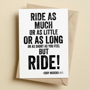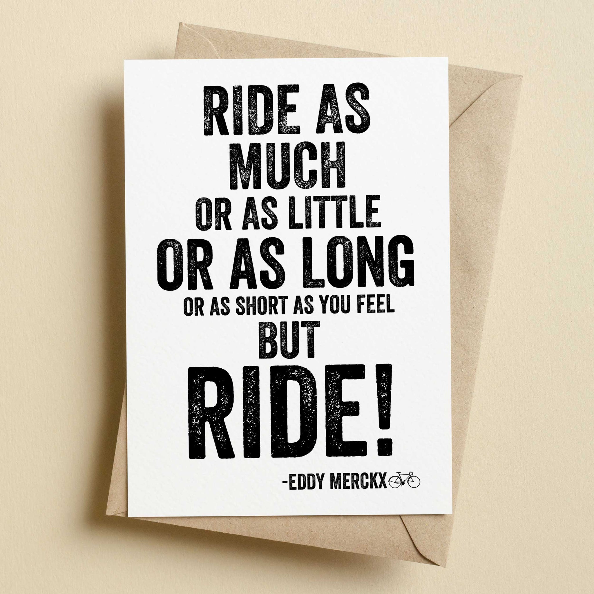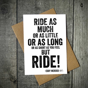 This famous quote from Eddy Merckx is one of our favourites. This cycling print design card is available as a greeting card in 2 sizes. Both sizes come complete with matching diamond flap envelopes. Cards are left blank inside for your message.