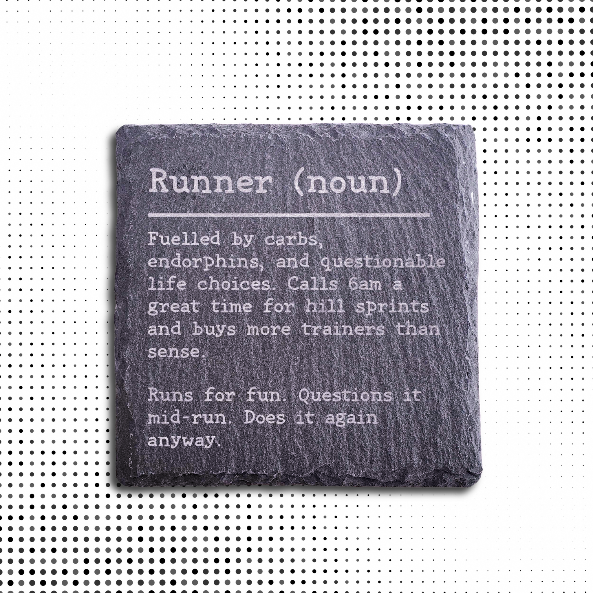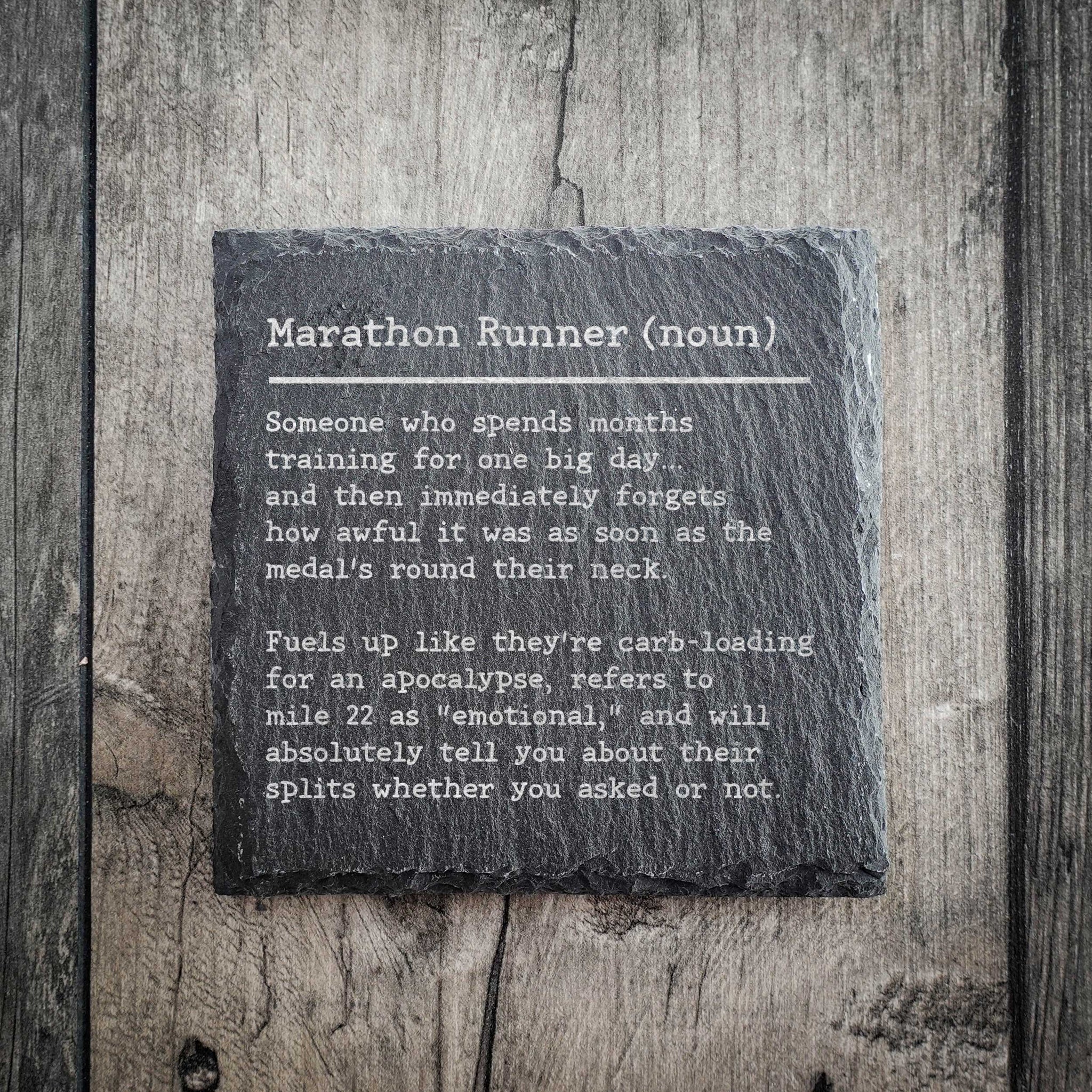 Add a smile to your coffee table (and your slightly unhinged marathon-running mate’s face) with our Funny Marathon Runner Dictionary Definition Slate Coaster. Each one’s hand-cut and laser engraved in our Yorkshire studio with a brilliantly daft ‘marathon runner’ definition – perfect for those who think 26.2 miles sounds like a lovely way to spend a Sunday.