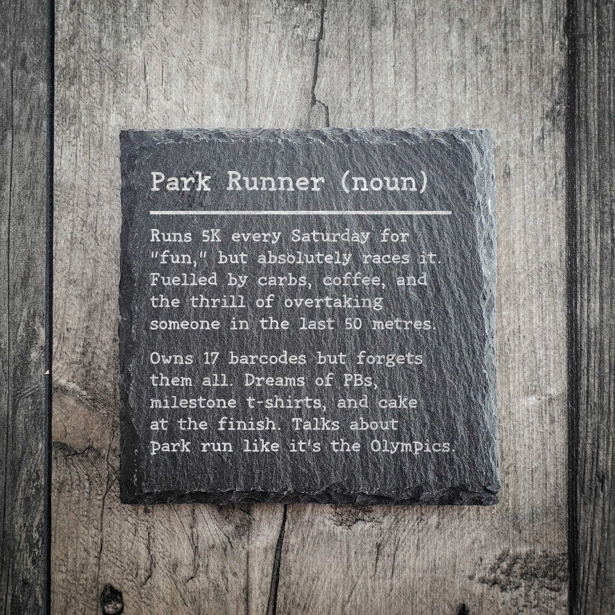 Add a smile to your coffee table (and your Park Run pal’s face) with our Funny Park Runner Dictionary Definition Slate Coaster. Crafted from hand-cut slate, each coaster is laser engraved in our Yorkshire studio with a tongue-in-cheek ‘Park Runner’ definition – perfect for anyone who lives for Saturday 5Ks, milestone t-shirts, and post-run cake.