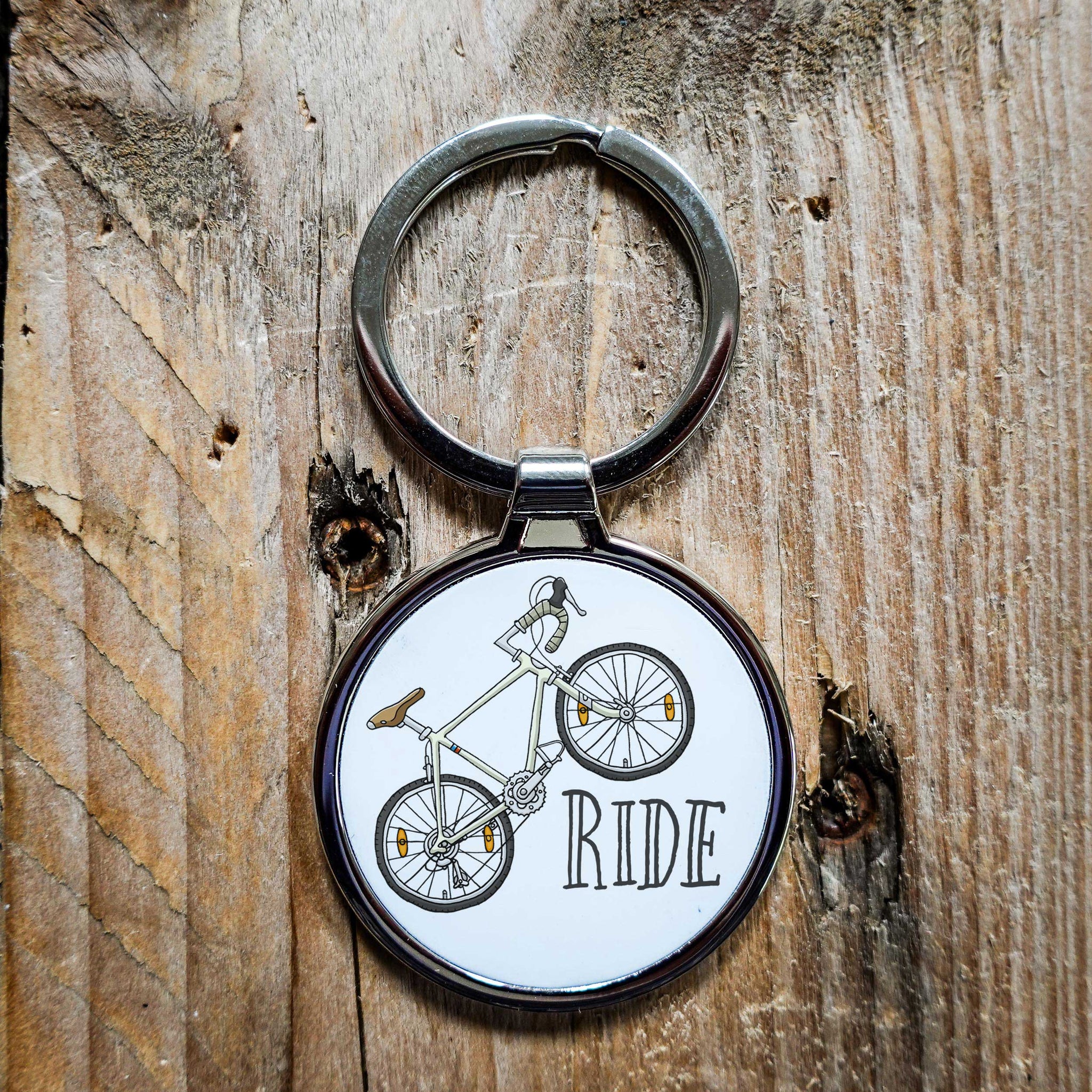 Simple, solid and perfect for cyclists. This round metal key ring features a colourful retro road bike design and the word RIDE. Made from durable zinc alloy with a smooth finish – ideal for keys, bags or the van.