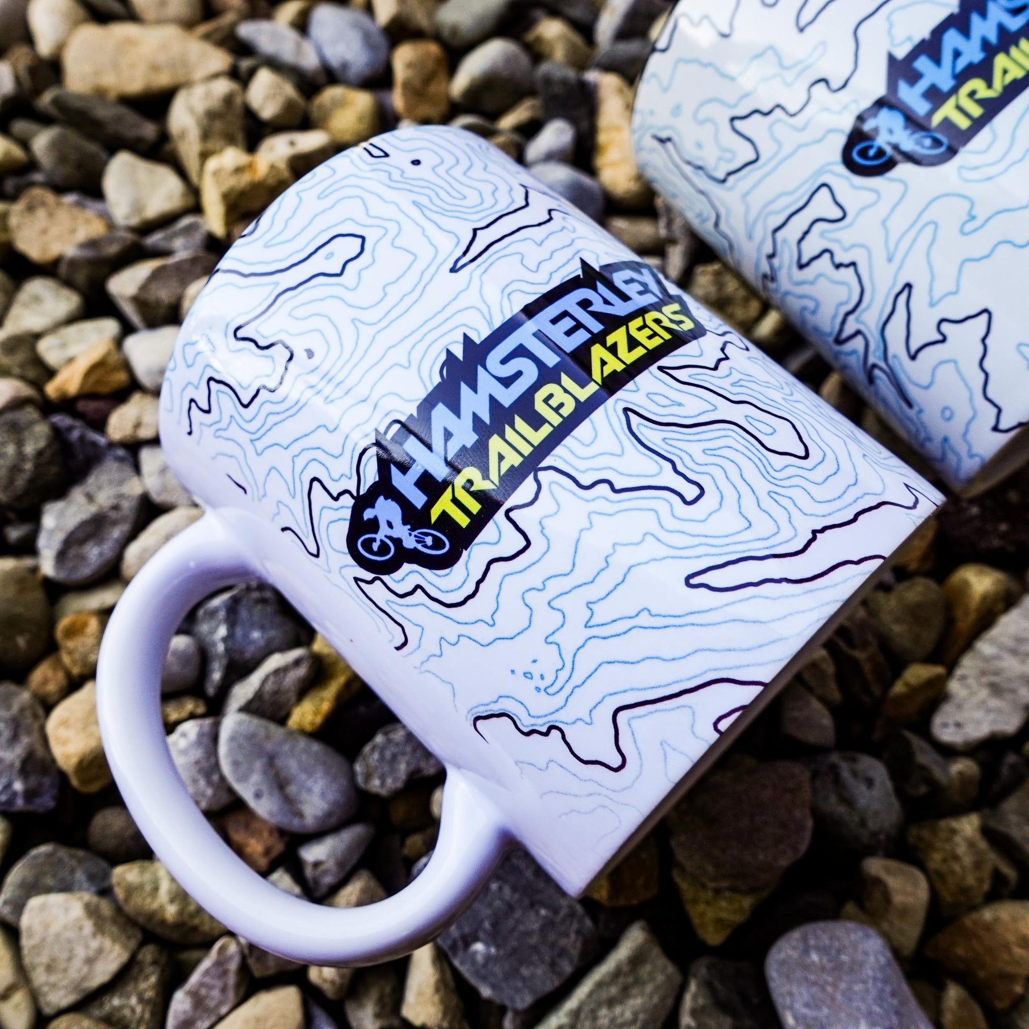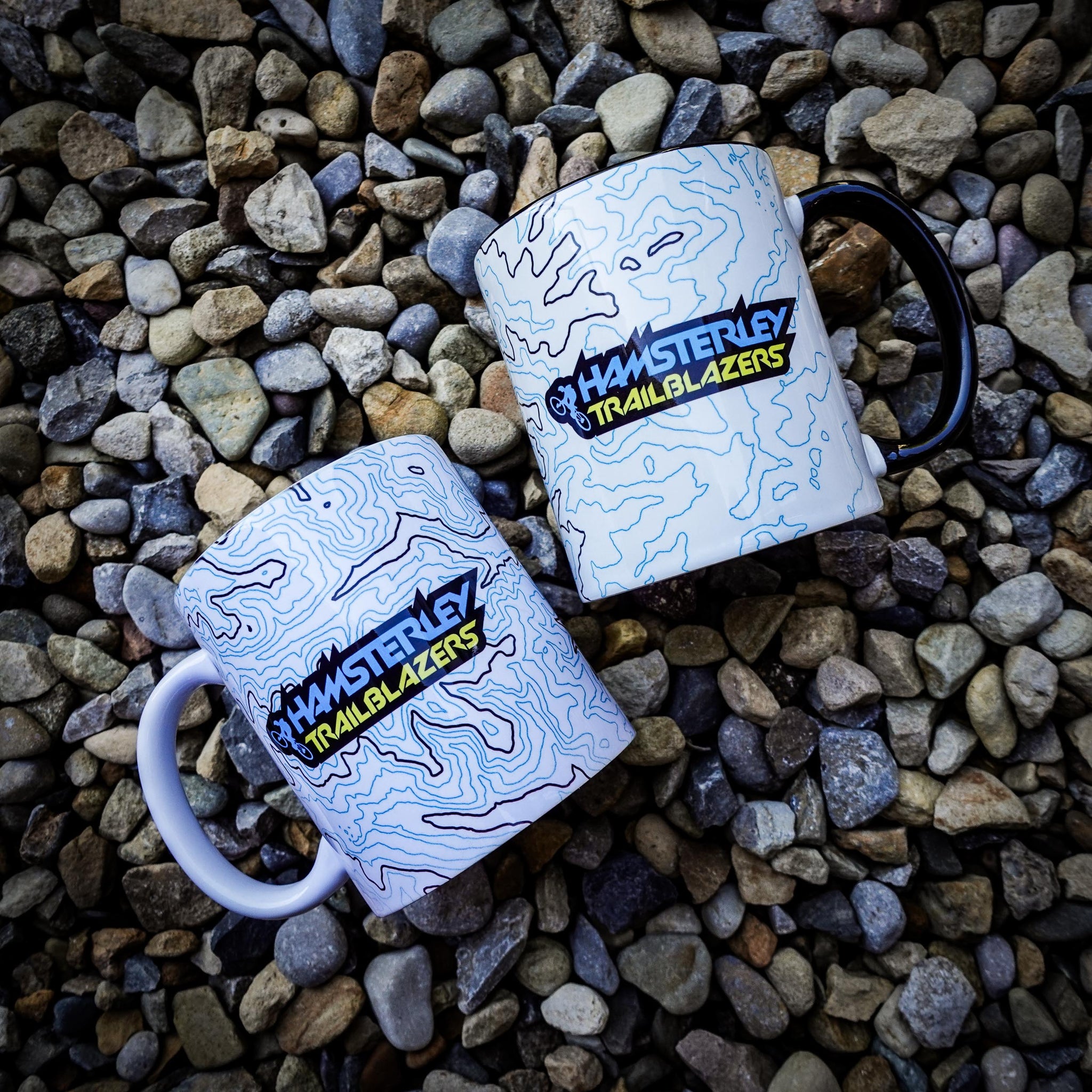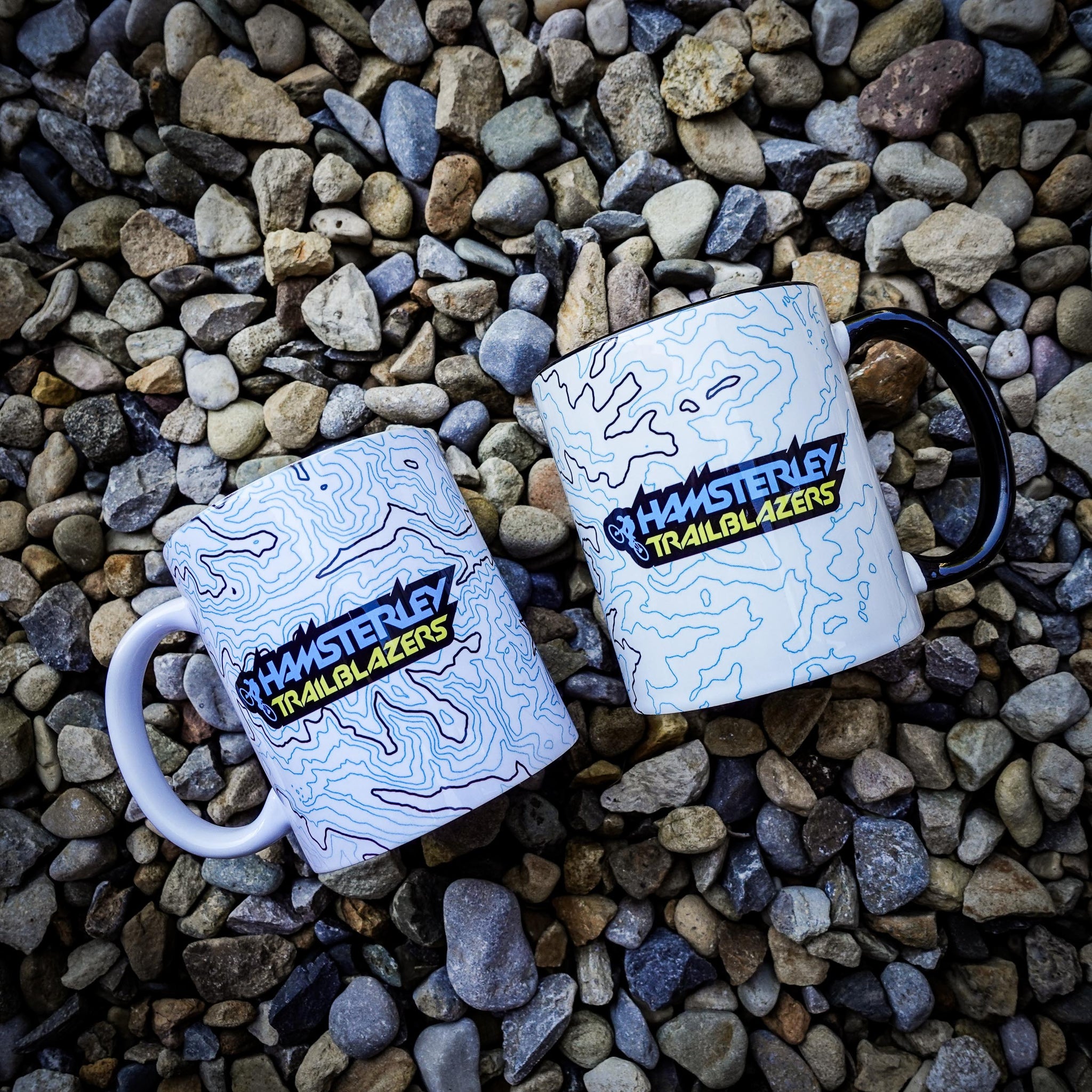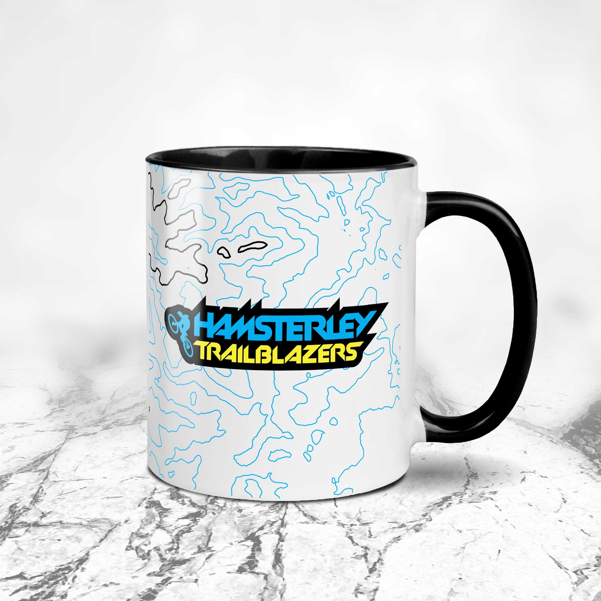 A classic 11oz ceramic mug featuring the Hamsterley Trailblazers logo and contours of the forest and surrounding area.