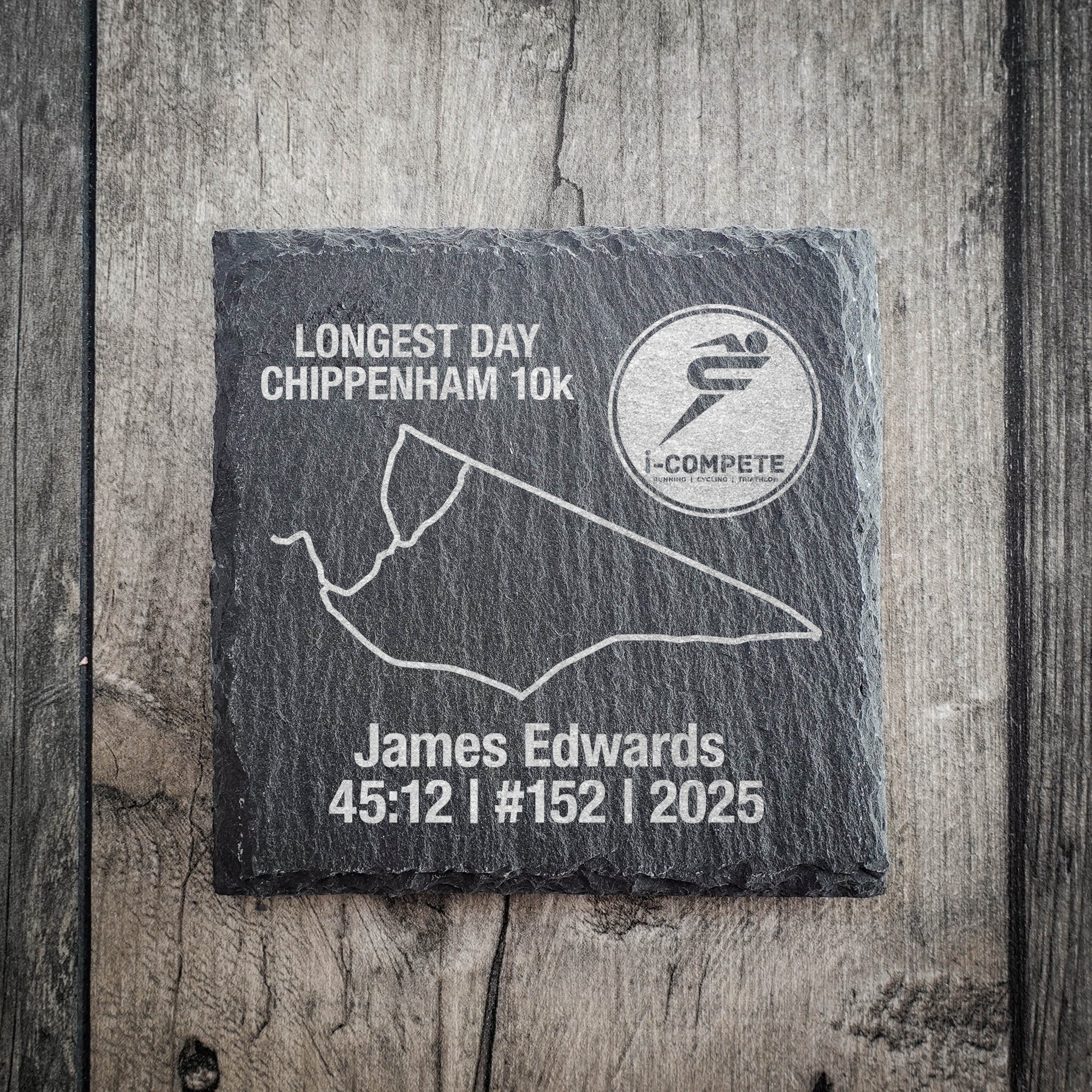 Celebrate your Chippenham 10k achievement with this official laser engraved slate coaster, created in collaboration with I-Compete Events. Featuring the event logo and route, each coaster can be personalised with your name, finish time, or a special message.