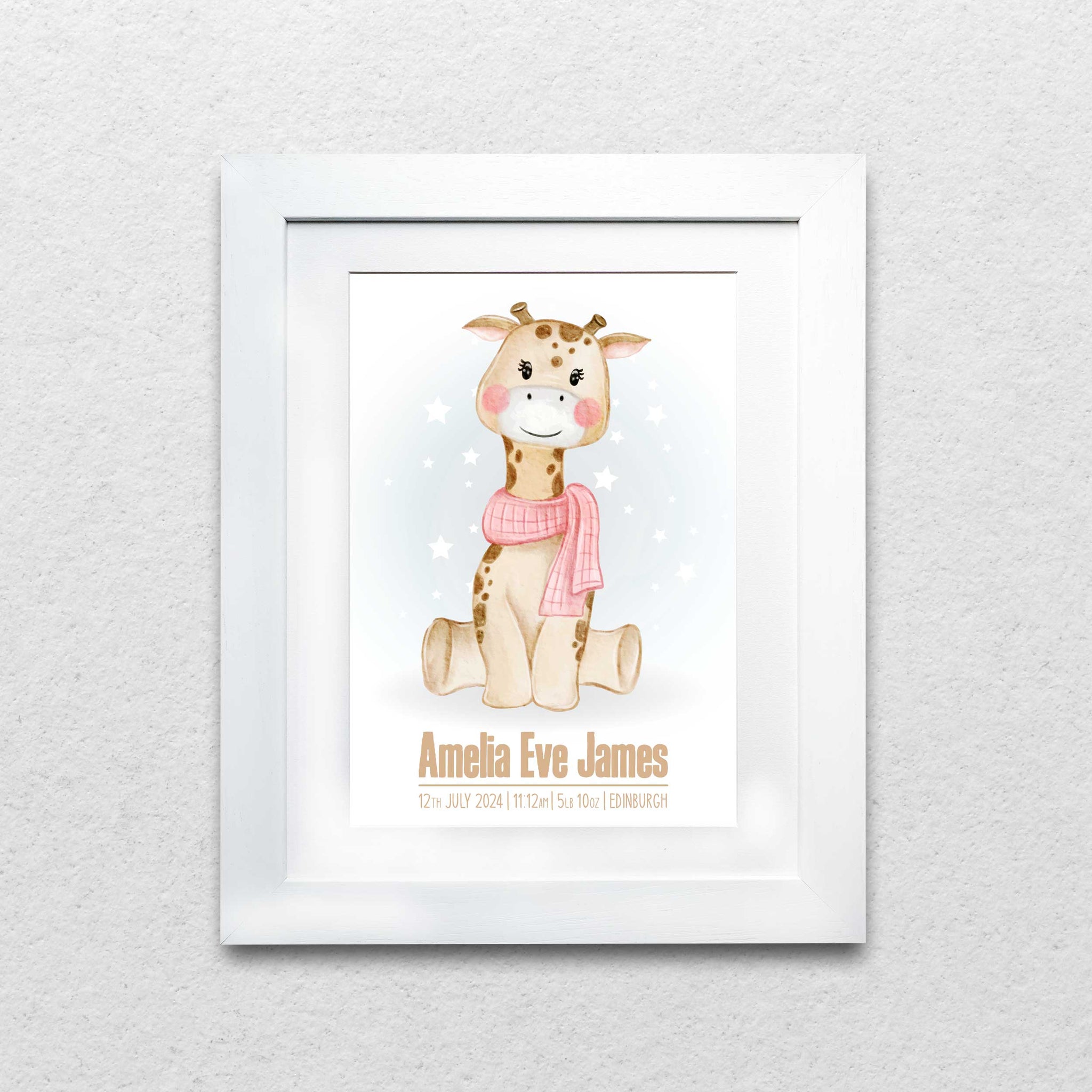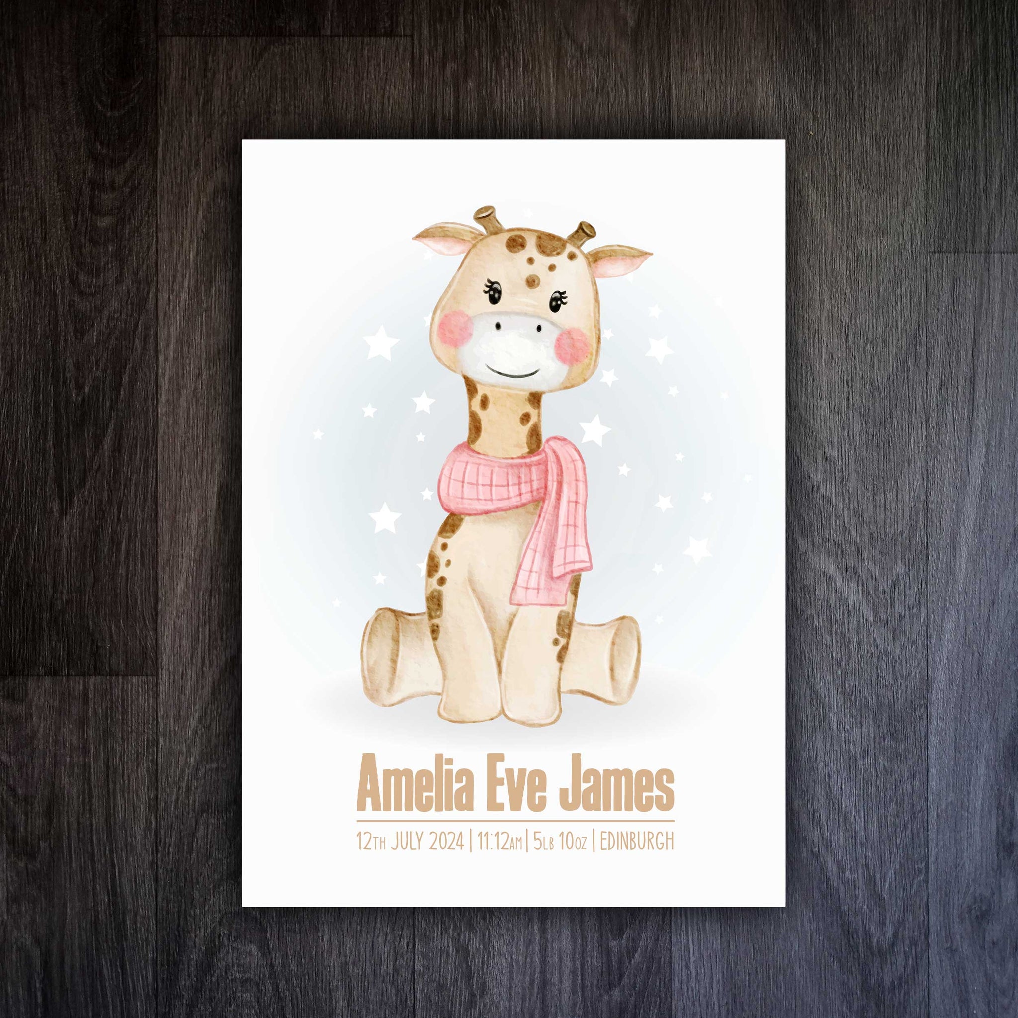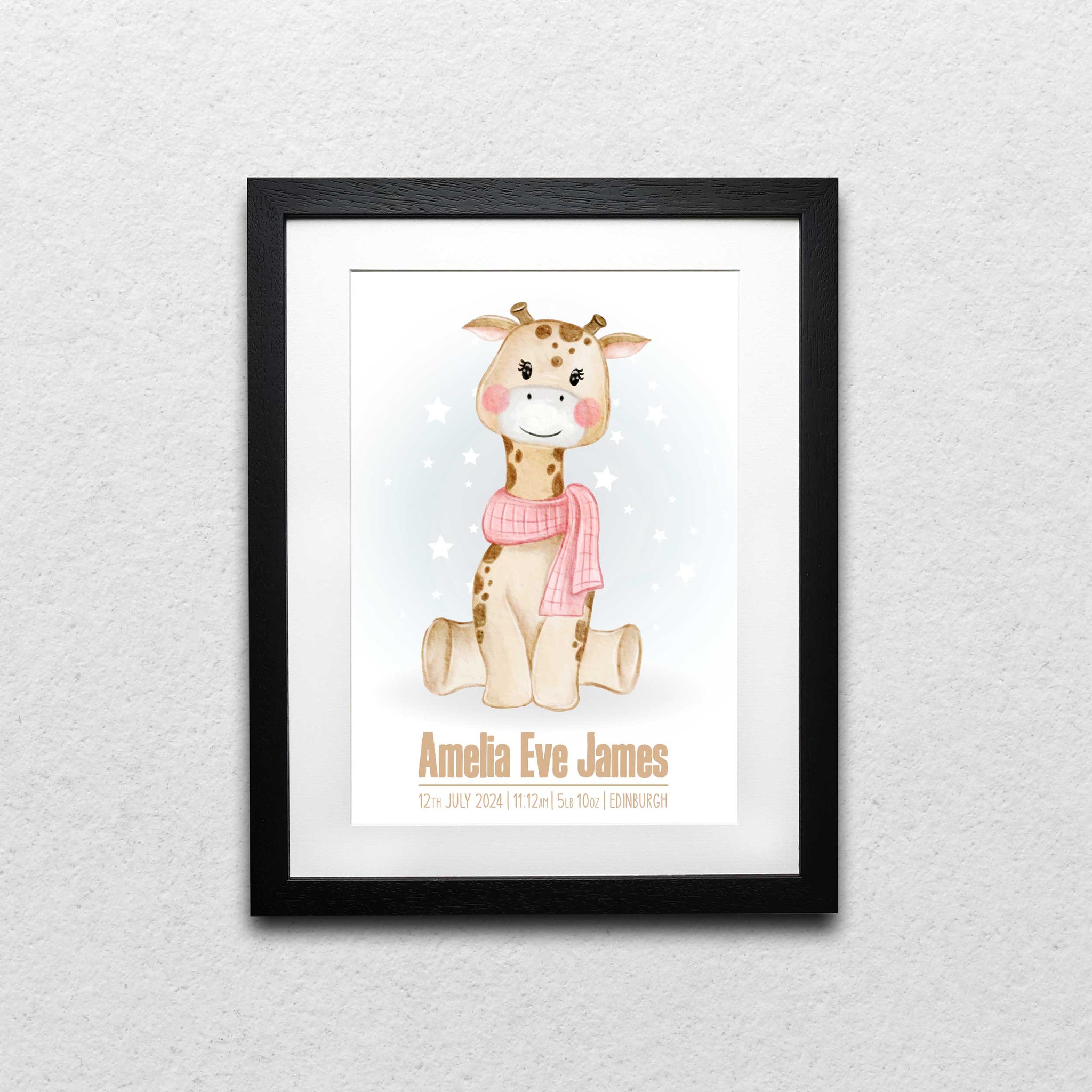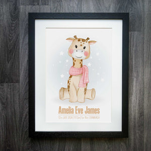 Experience the charm of this personalised giraffe print, a unique piece of art that adds a touch of warmth to any space. This piece stands out due to its significant features: