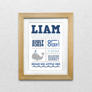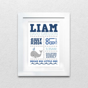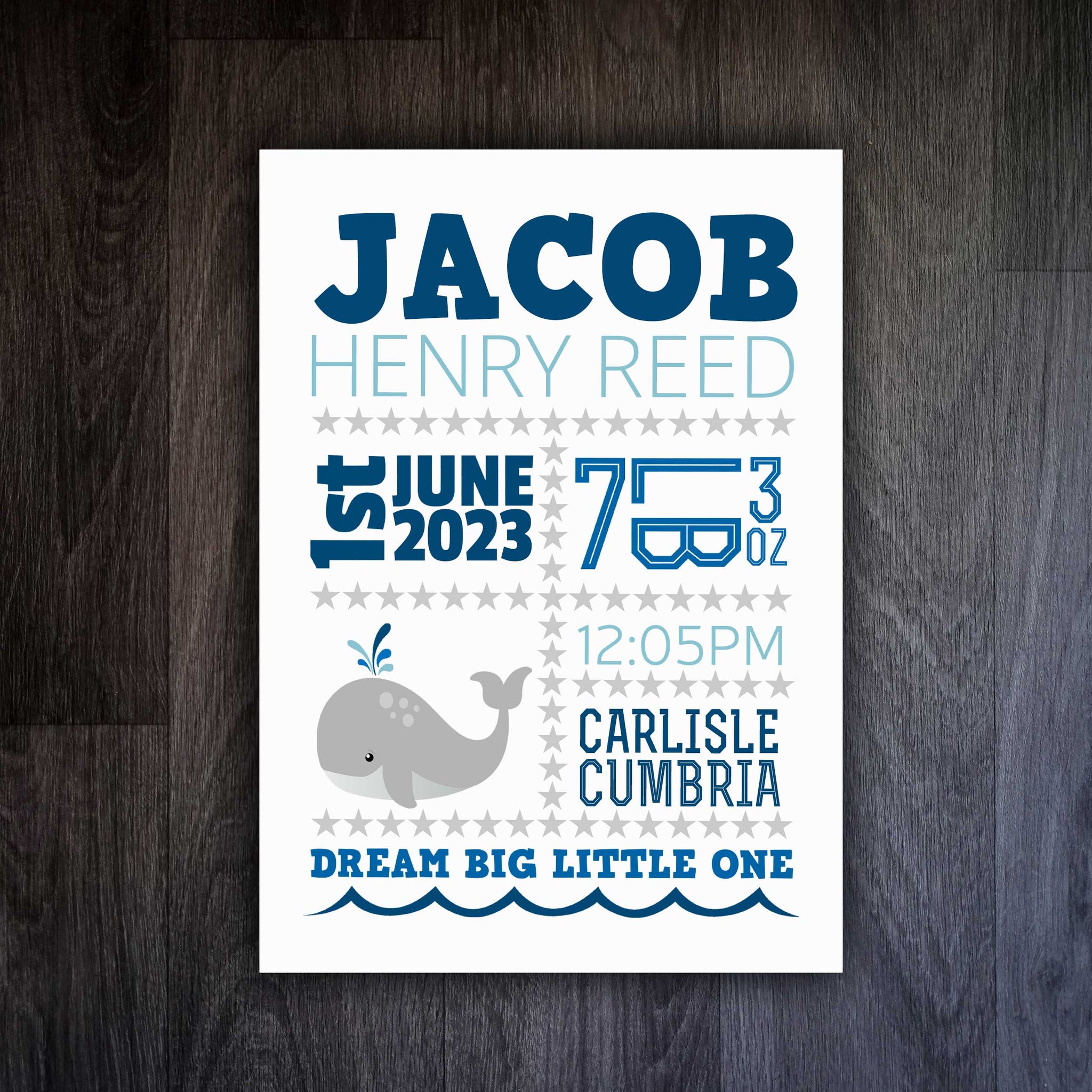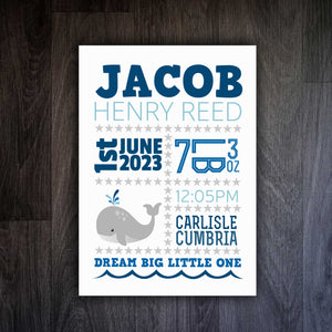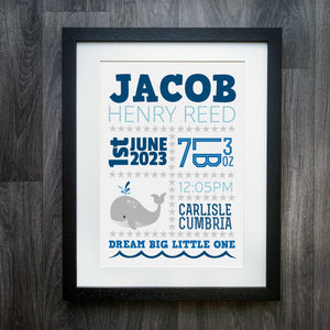 Transform your nursery with our colourful personalised baby whale birth details print. This bright, punchy print, customised with those vital birth statistics and crafted in Yorkshire, makes a lively and engaging addition to any room. The vibrant colours of the baby whale design not only light up your nursery decor but also serve as a cherished keepsake for newborn celebrations, christenings, or baptism events.