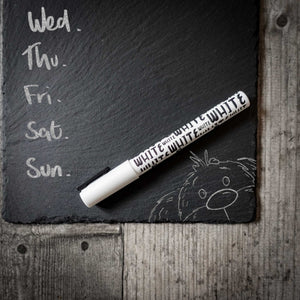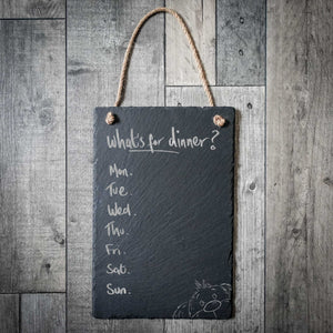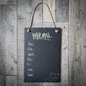 Introducing Scruffle – our wonderfully scruffy little dog who’s here to help you stay organised all week long! Hand-drawn by the talented Richard Scribbles, this slate weekly menu board features Scruffle peeking up from the corner with his trademark floppy ears and fuzzy charm.