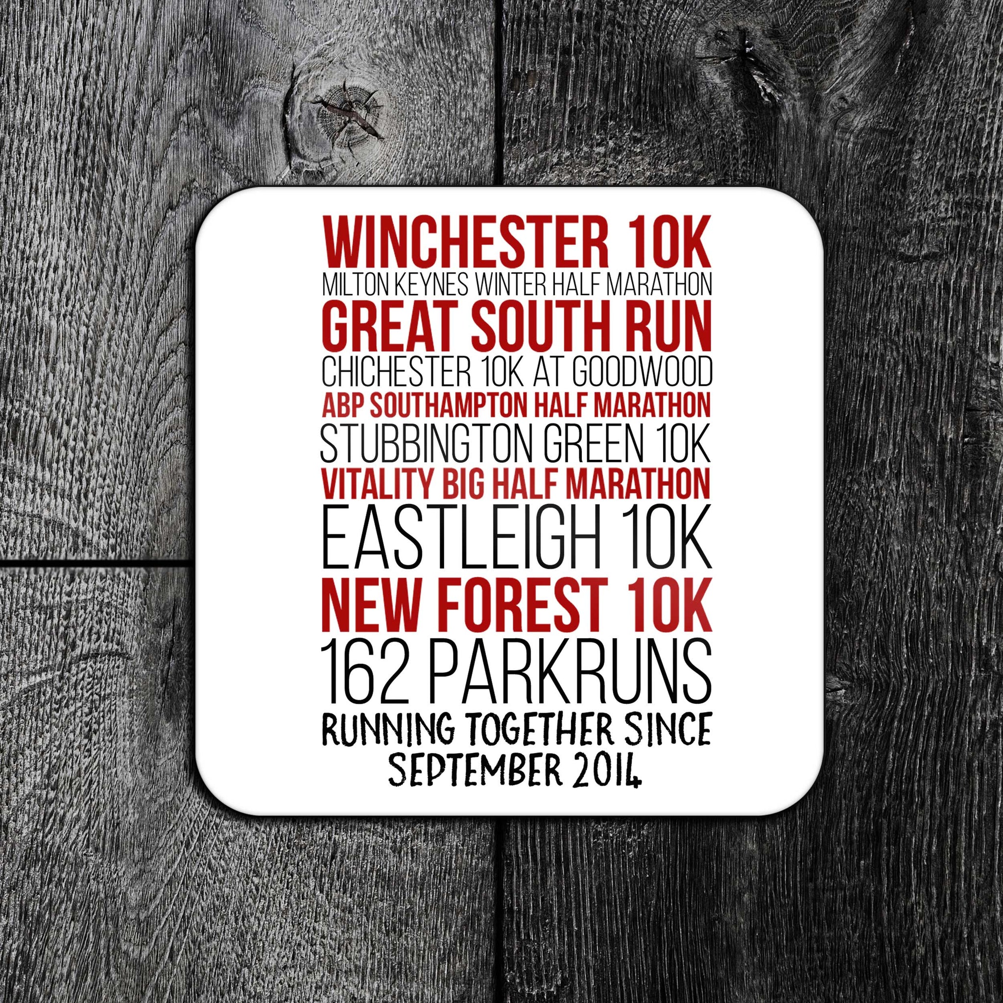 This coaster is a great gift for your partner or running buddy. You can personalise the coaster with the runs you have achieved together and also personalise the final text line.