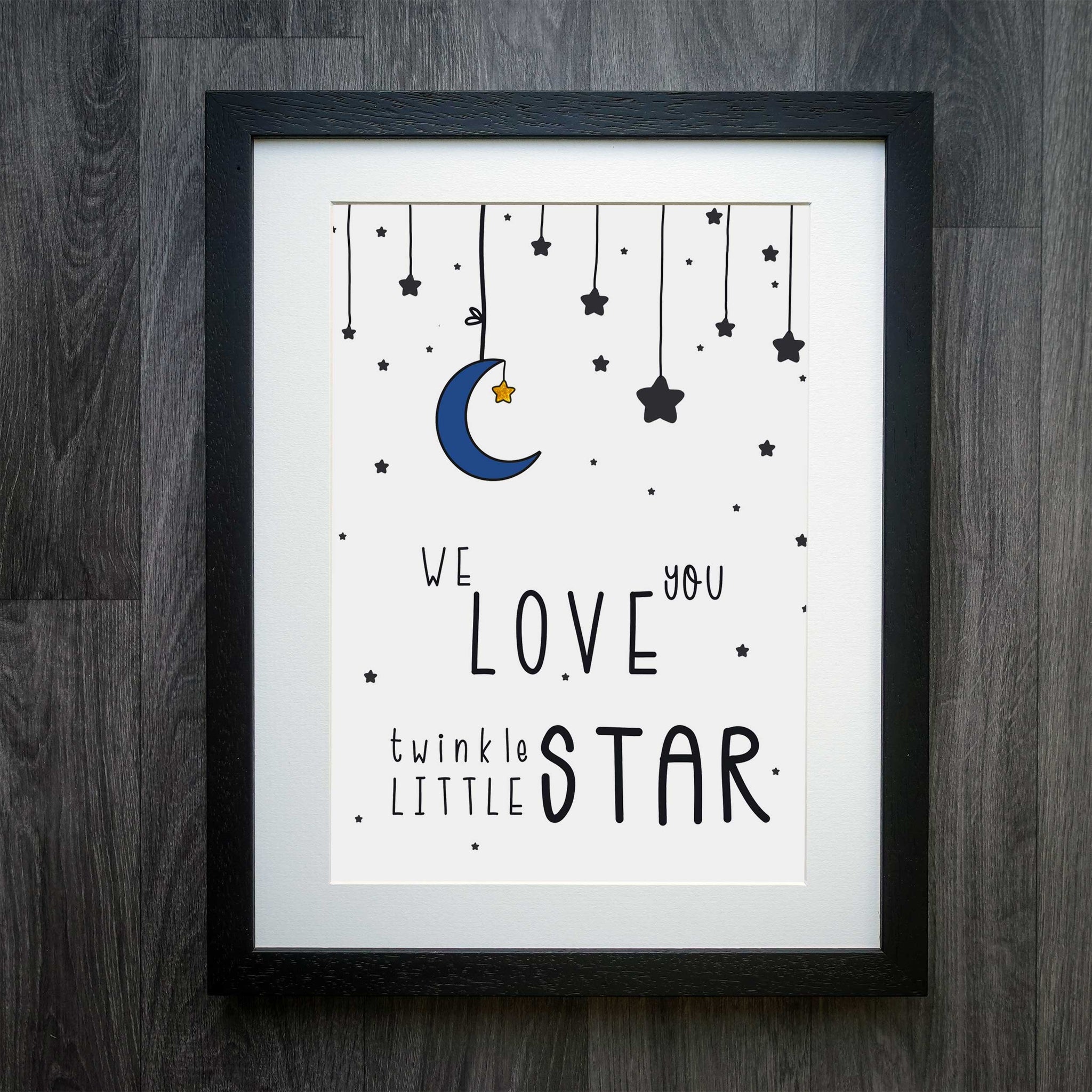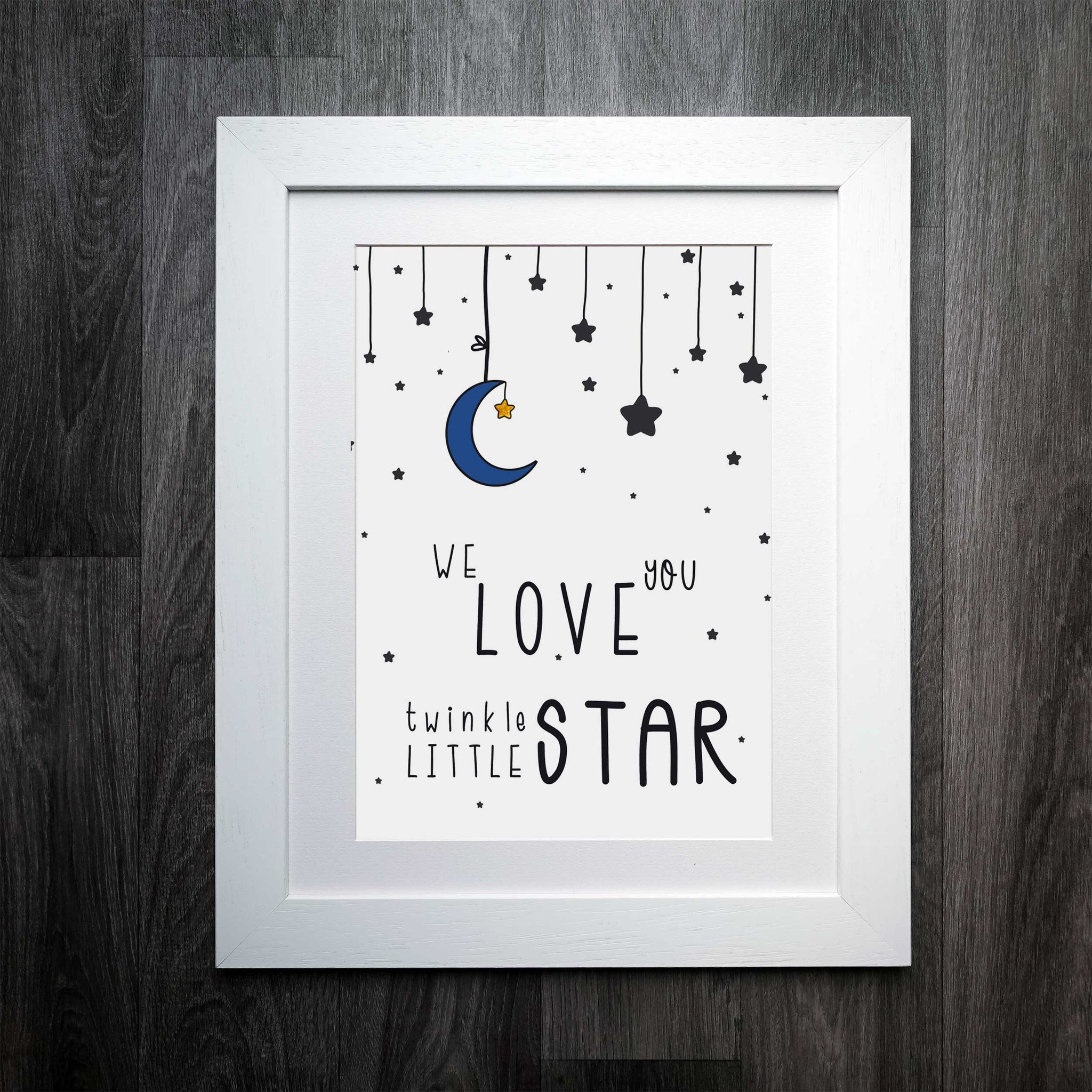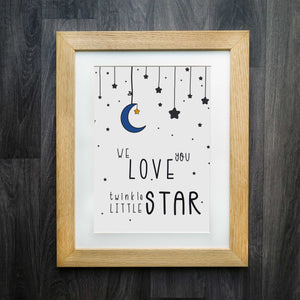 Let the stars twinkle a little brighter in your nursery with our "We Love You - Twinkle Little Star" print. Designed to captivate both young eyes and the young at heart, this celestial-themed print features a charming moon and star ensemble that adds a dash of cosmic elegance to any room. It's not just a fantastic addition to your own child's nursery; it also makes a wonderful and unique christening gift.