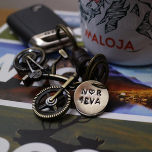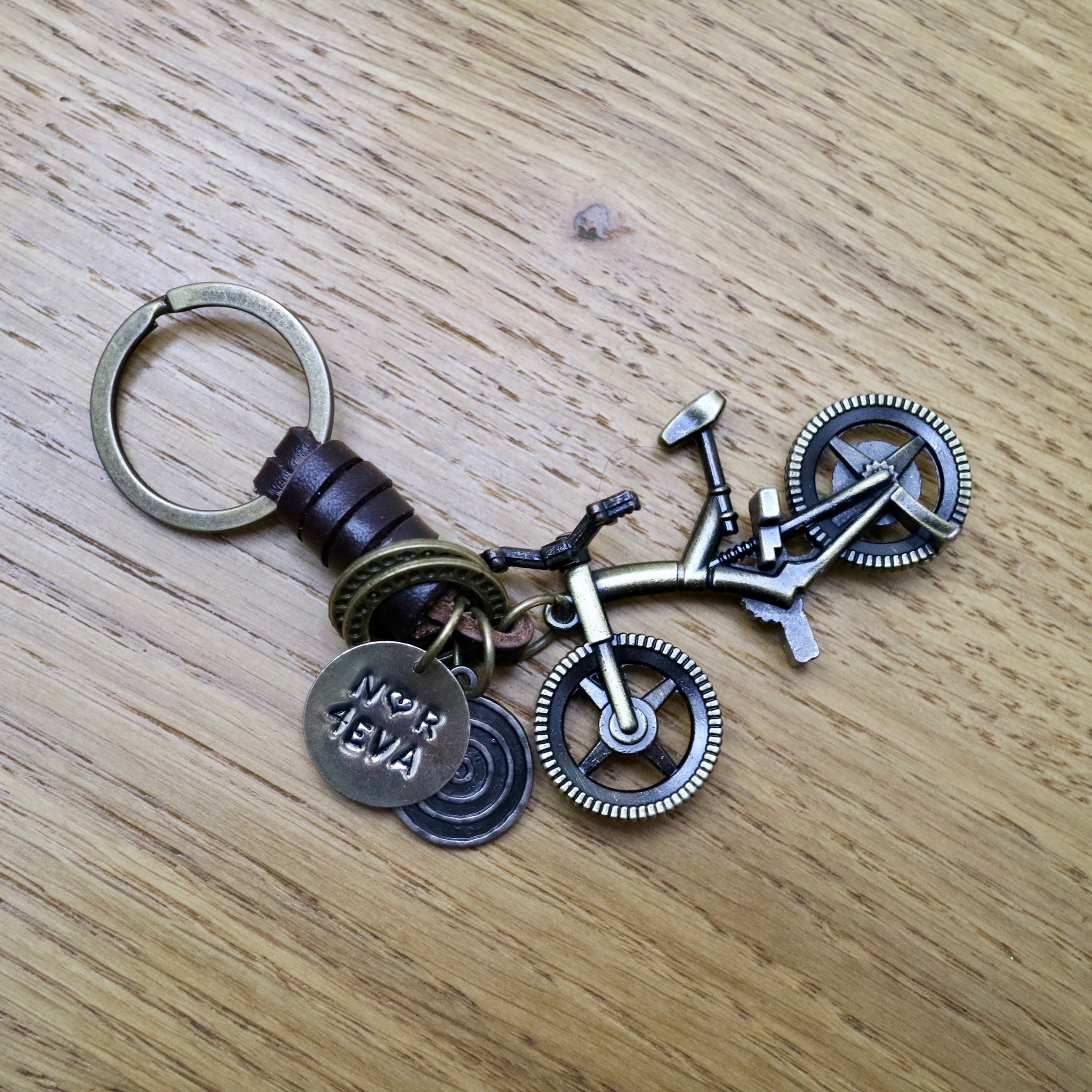 Antique bronze plated vintage mountain bike keyring. Made from alloy with real leather strap.