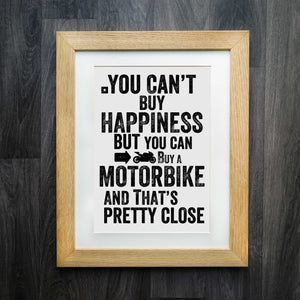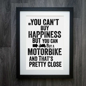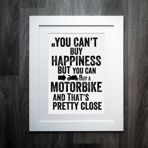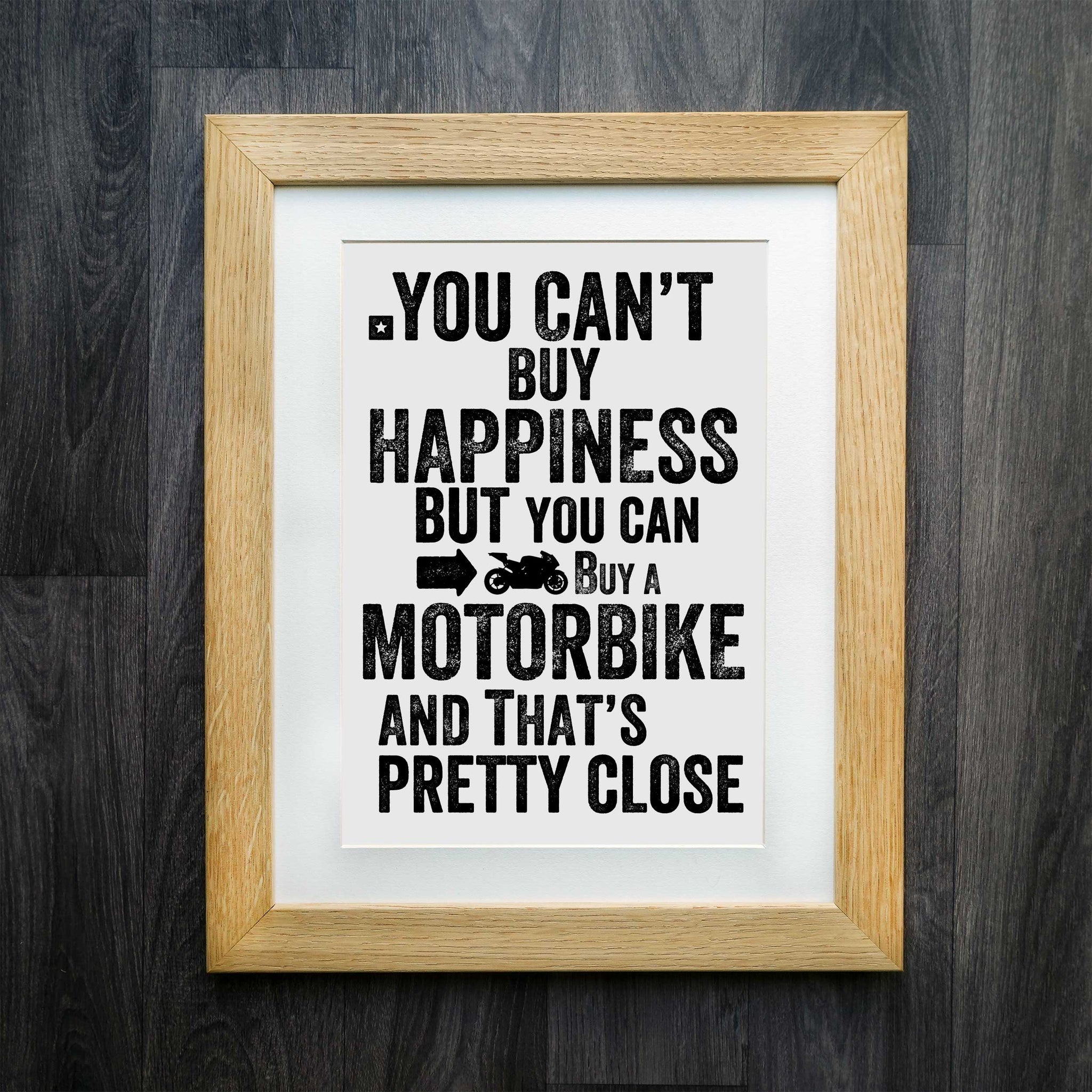 Some say you can't buy happiness, but we beg to differ. For the motorcycle aficionado in your life, our You Can't Buy Happiness Motorbike Print is as close to joy as a twist of the throttle. Exclusively available at EllieBeanPrints, this striking piece of wall art captures the thrill of the ride and the passion for two-wheeled adventure. Whether you're shopping for yourself or seeking an amazing gift for a motorcycle-crazy person, this print hits the mark, combining unique design with the undying love for the open road.